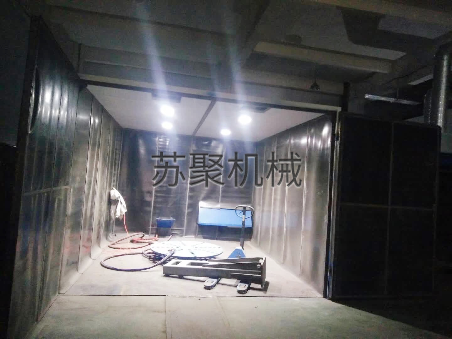 自動機械式回收噴砂(丸)房為平車往復(fù)式專用噴丸機,它由噴丸室體、噴丸器、螺旋輸送機、提升機、分離器、彈丸控制系統(tǒng)、照明系統(tǒng)、除塵系統(tǒng)、輸送平車、電控系統(tǒng)等部分組成。